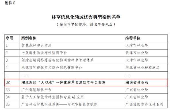 近日,为挖掘推广林草信息化先进经验,国家林业和草原局网络安全和信息化工作领导小组发布全国范围内106个林草信息化领域典型案例。在此次评审中,由林科达承建的湖南省湘江新区“天空地”一体化林草资源监管平台成功跻身全国林草信息化领域优秀典型案例名单,成为全国为数不多的地市级入选项目之一,这标志着湘江新区在数字赋能林业现代化发展方面走在了全国前列,也充分体现了该平台在林草资源数字化监管领域的先进性和示范性。
